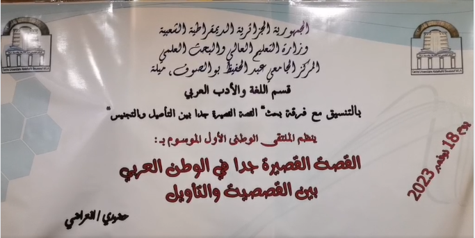 نظم معهد الآداب واللغات للمركز الجامعي عبدالحفيظ بوالصوف بميلة الملتقى الوطني الأول تحت عنوان: “القصة القصيرة جدا في الوطن العربي بين القصصية والتأويل” يوم 18 نوفمبر 2023 برئاسة الدكتورة: مريم بغيبغ .