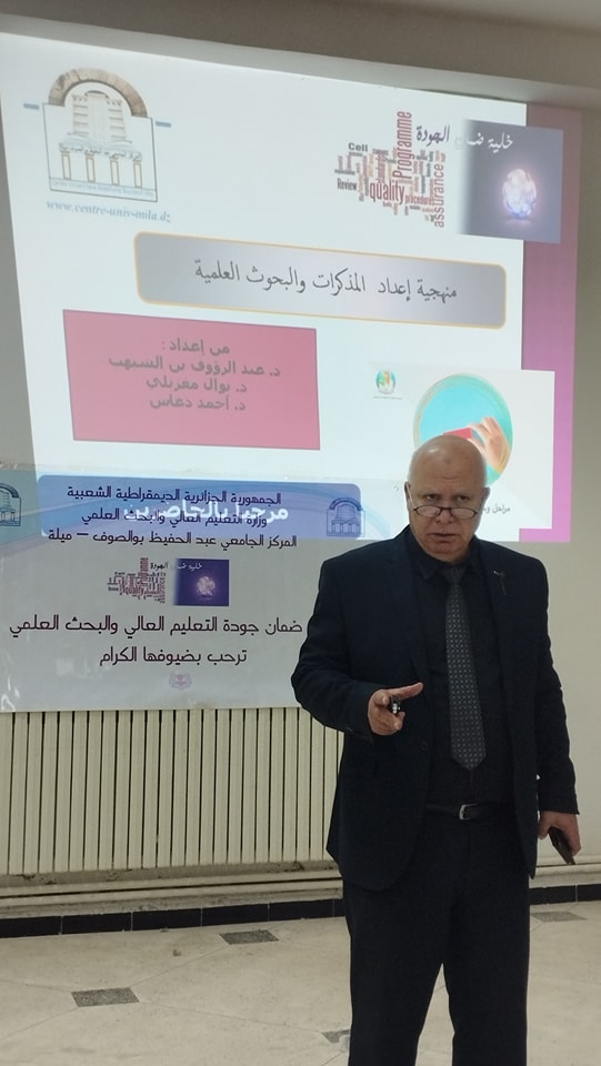 نظمت خلية ضمان جودة التعليم والبحث العلمي للمركز الجامعي عبد الحفيظ بالصوف ميلةيوما تكوينا لفائدة طلبة الماستر2والثالثةليسانس حول منهجيةو كيفية اعداد مذكرة التخرج بالمكتبة المركزية للجامعة. بعد الاستماع لآيات بينات من الذكر الحكيم والنشيد الوطني قدم مسؤول الخلية الدكتور فاتح مرزوق كلمة ترحيبة للحضور الكريم من طلبة واساتذة الدكتور احمد دعاس والدكتور عبد الرؤوف بن الشيهب و الدكتورة نوال مغزيلي ومسؤولين محافظ المكتبة المركزية السيد عبد الله بن صالح، والسيد الطاهر بوثلجة النائب والوسائل والمحاسبة والتسيير. كما شرح الهدف من اليوم التكويني لفائدة الطلبة للالتزام بالمنهجية واتجاز بحوث ذات جودة…