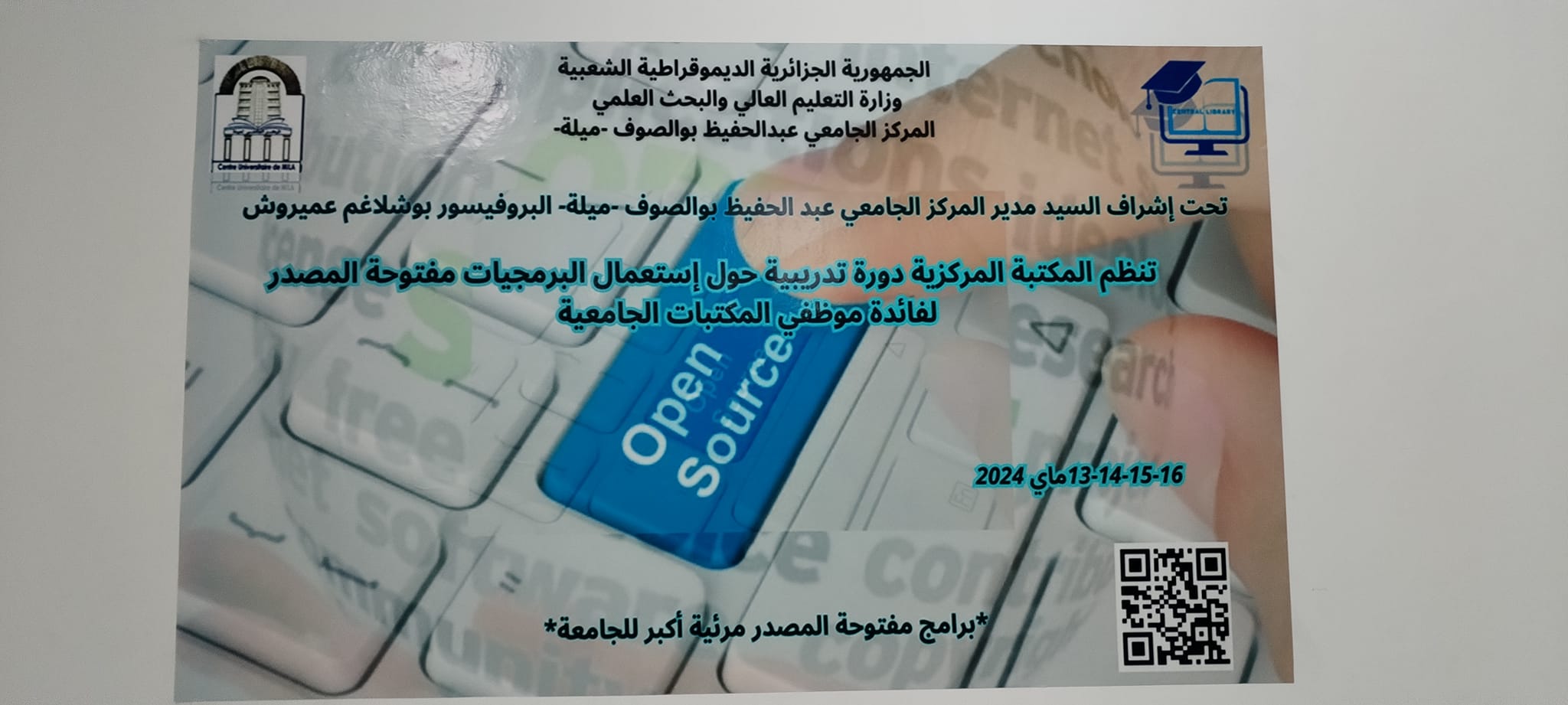 بإشراف السيد عميروش بوشلاغم، مدير المركز الجامعي عبد الحفيظ بوالصوف بولاية ميلة، نظمت دورة تدريبية حول استخدام البرمجيات مفتوحة المصدر لفائدة موظفي المكتبات الجامعية.